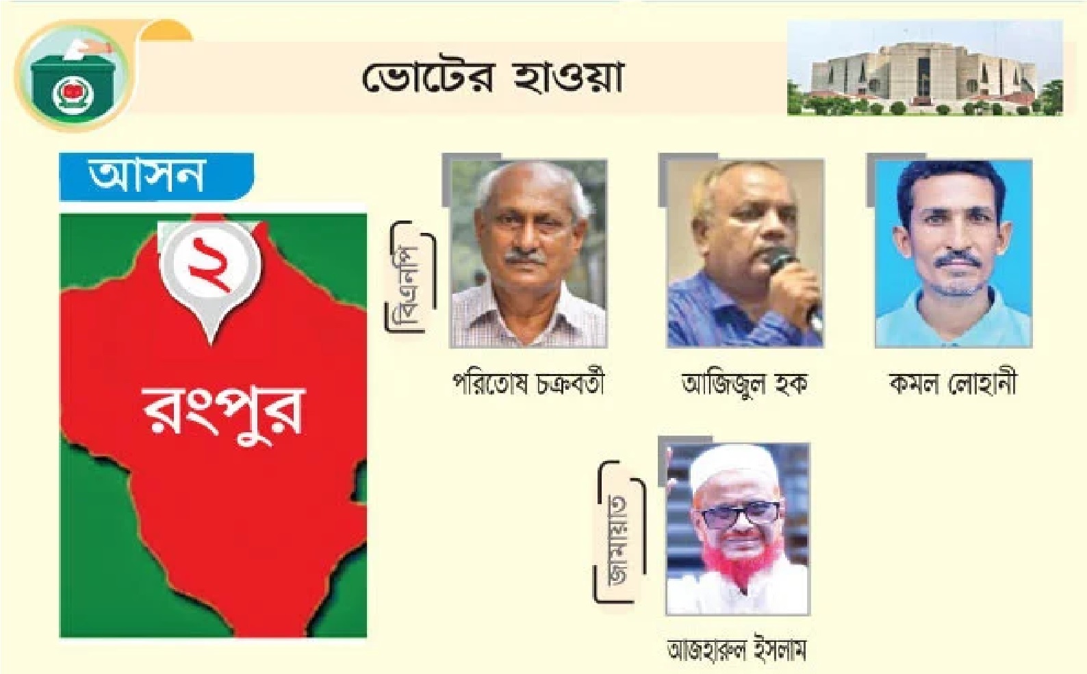 আসন্ন ত্রয়োদশ জাতীয় সংসদ নির্বাচন ঘিরে রংপুর-২ আসনে জমে উঠেছে নির্বাচনী প্রচারণা। বদরগঞ্জ ও তারাগঞ্জ উপজেলার ১৫ ইউনিয়ন নিয়ে গঠিত এই আসনে দিন-রাত প্রচারণায় ব্যস্ত বিএনপি, জামায়াতে ইসলামী, ইসলামী আন্দোলন, গণঅধিকার পরিষদসহ বিভিন্ন দলের প্রার্থীরা।