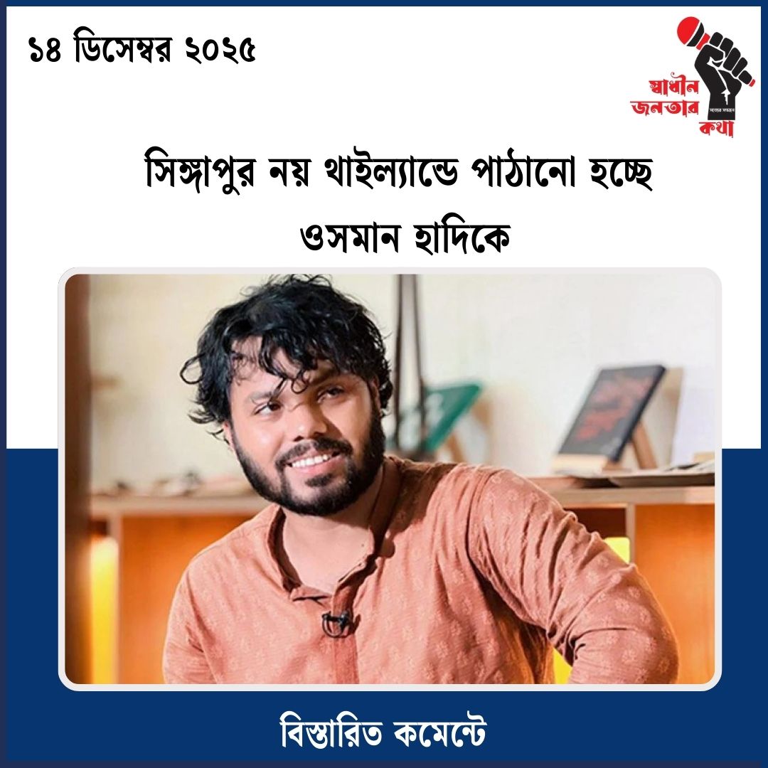 সিঙ্গাপুর নয় উন্নত চিকিৎসার জন্য আগামীকাল সোমবার থাইল্যান্ডের ব্যাংকক হাসপাতালে নেয়া হচ্ছে ইনকিলাব মঞ্চের আহ্বায়ক ও ঢাকা-৮ আসনের সংসদ সদস্য প্রার্থী শরিফ ওসমান হাদিকে। বোরবার বিকেলে হাদির ভাই ওমর বিন হাদি আমার দেশকে এ তথ্য জানান। সরকার এ ব্যাপারে হাদির পরিবারকে সম্পূর্ণ সহযোগিতা করছে বলেও জানান তিনি।